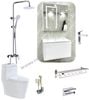 Với bồn cầu có thiết kế hiện đại, dễ vệ sinh và kết hợp tốt với các thiết bị khác trong combo, bạn sẽ có một trung tâm vệ sinh tiện nghi và dễ sử dụng. Chậu lavabo cùng vòi lavabo chất lượng cao cung cấp trải nghiệm rửa tay sạch sẽ, thoải mái. Sen cây là phần không thể thiếu để mang đến trải nghiệm thư giãn dưới dòng nước ổn định. Các phụ kiện inox 304 như giá treo, vắt khăn hay xi phông đều góp phần hoàn thiện không gian phòng tắm gọn gàng và tiện nghi hơn.